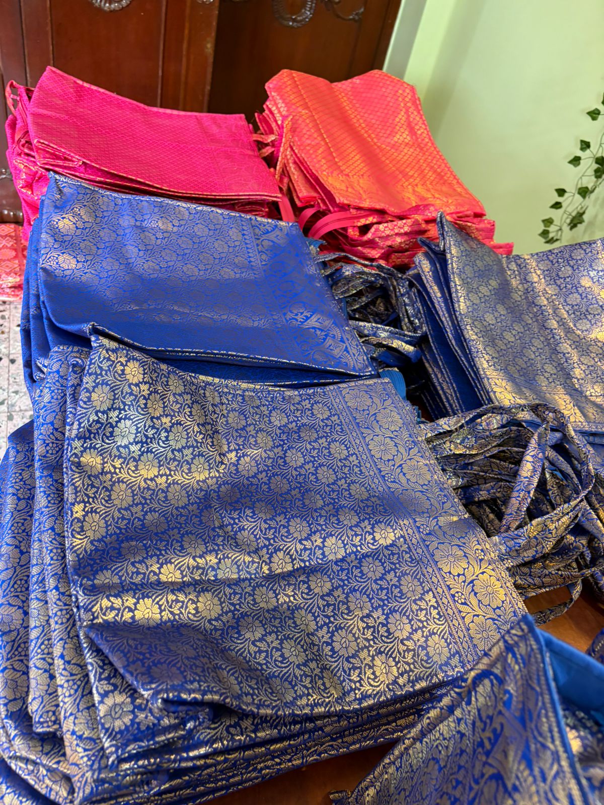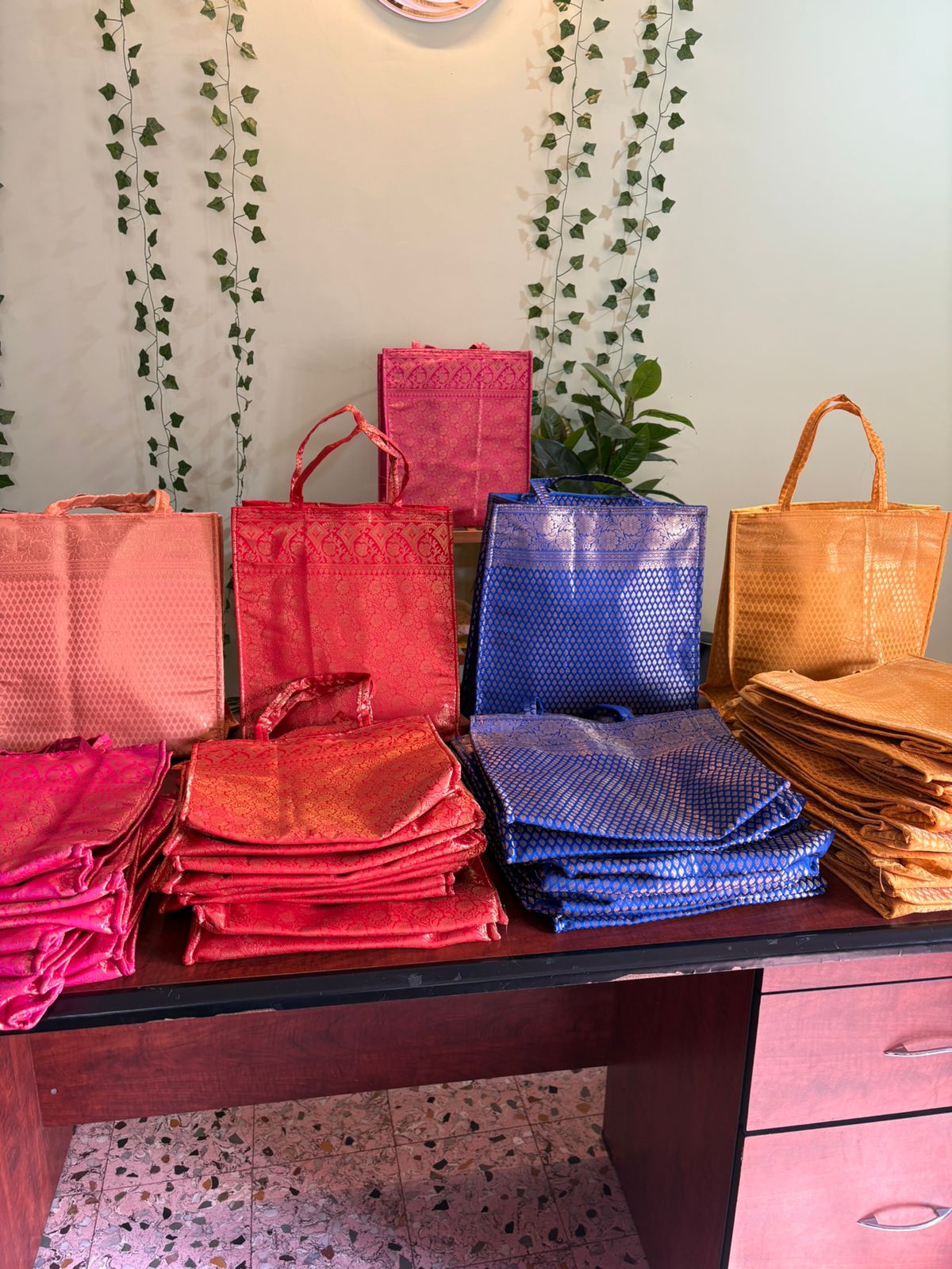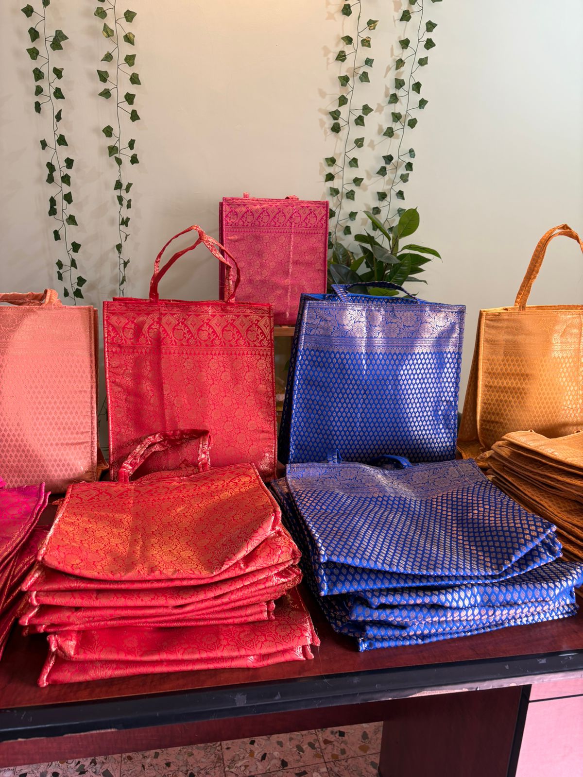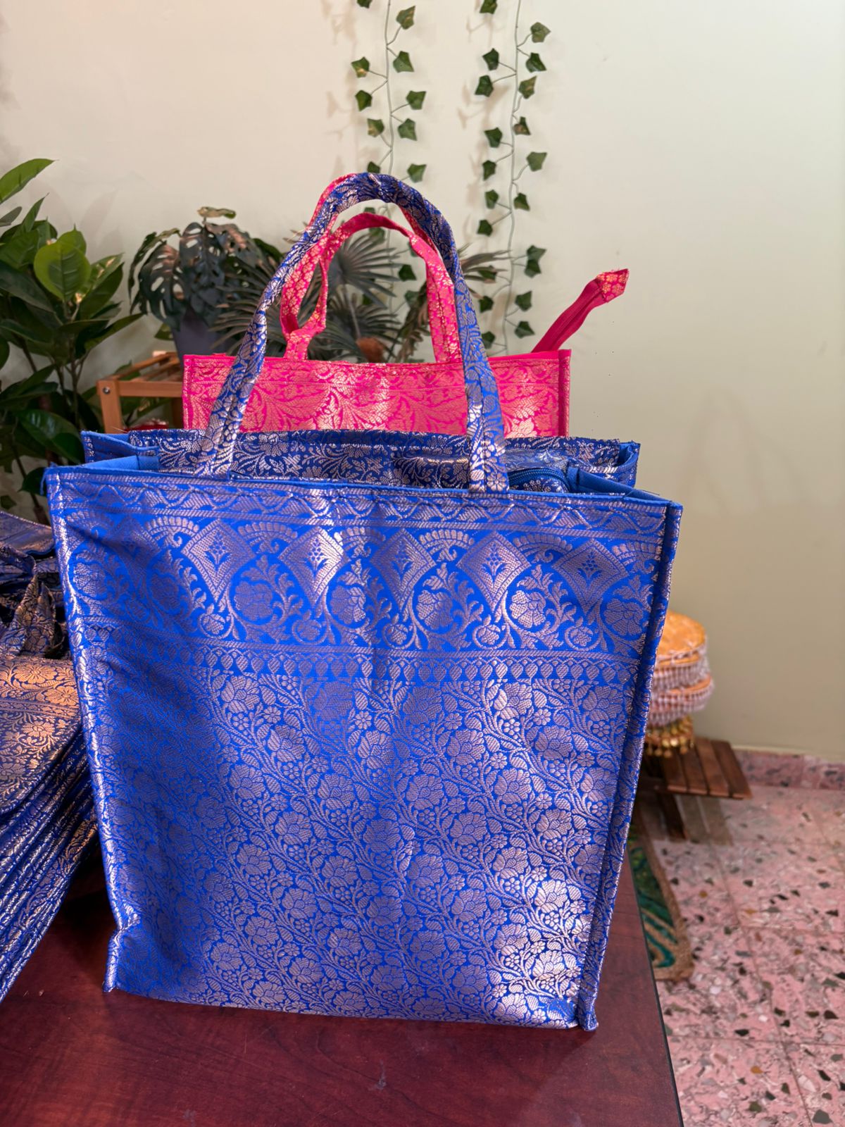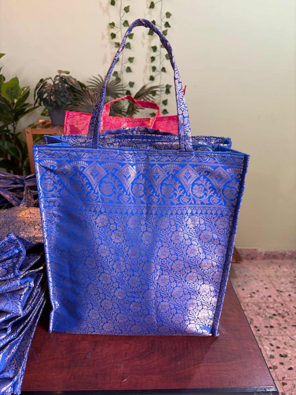Very Rich And Luxurious Looking Bags Made From Premium Banarasi Silk Fabric With Double Lining Inside And Matching Handles. They Make For A Great Gifting Option In Which You Can Gift Sarees, Clothes, Or Any Other Item. This bag comes with a zip also.