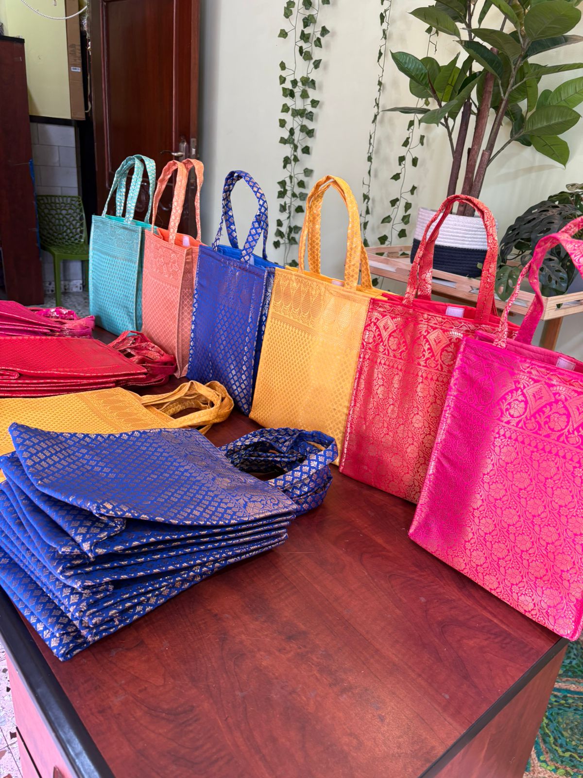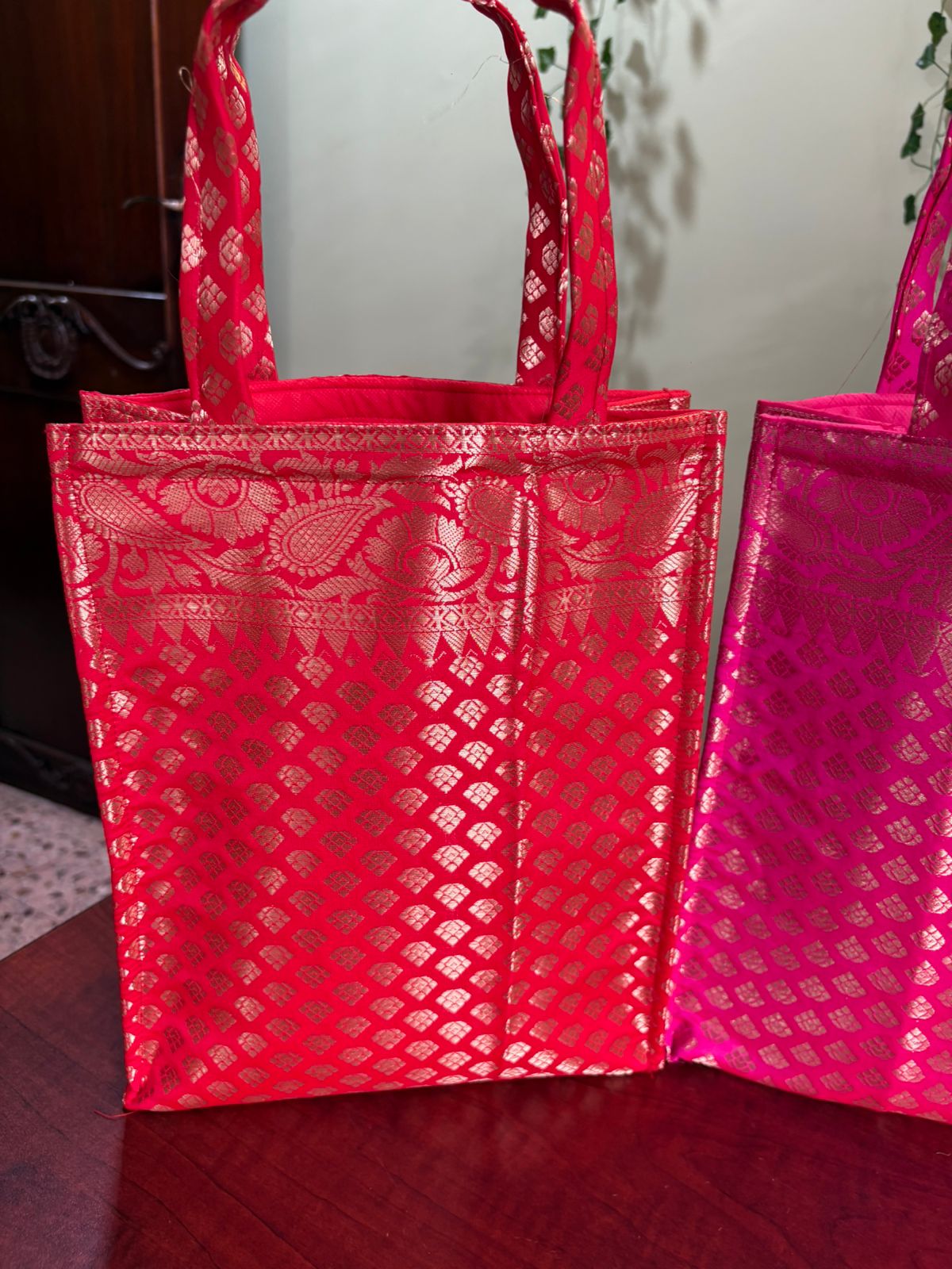 Very Rich And Luxurious Looking Bags Made From Premium Beanrsi Silk Fabric With Double Lining Inside And Matching Handles. They Make For A Great Gifting Option In Whihc You Can Gift Sarees, Clothes, Or Any Other Item.