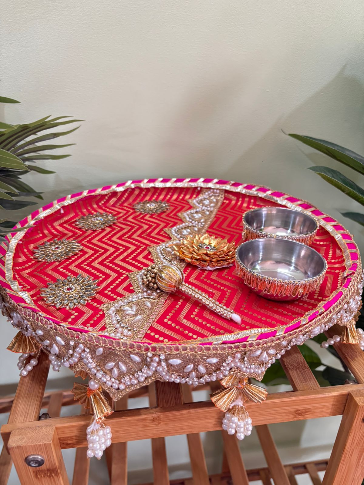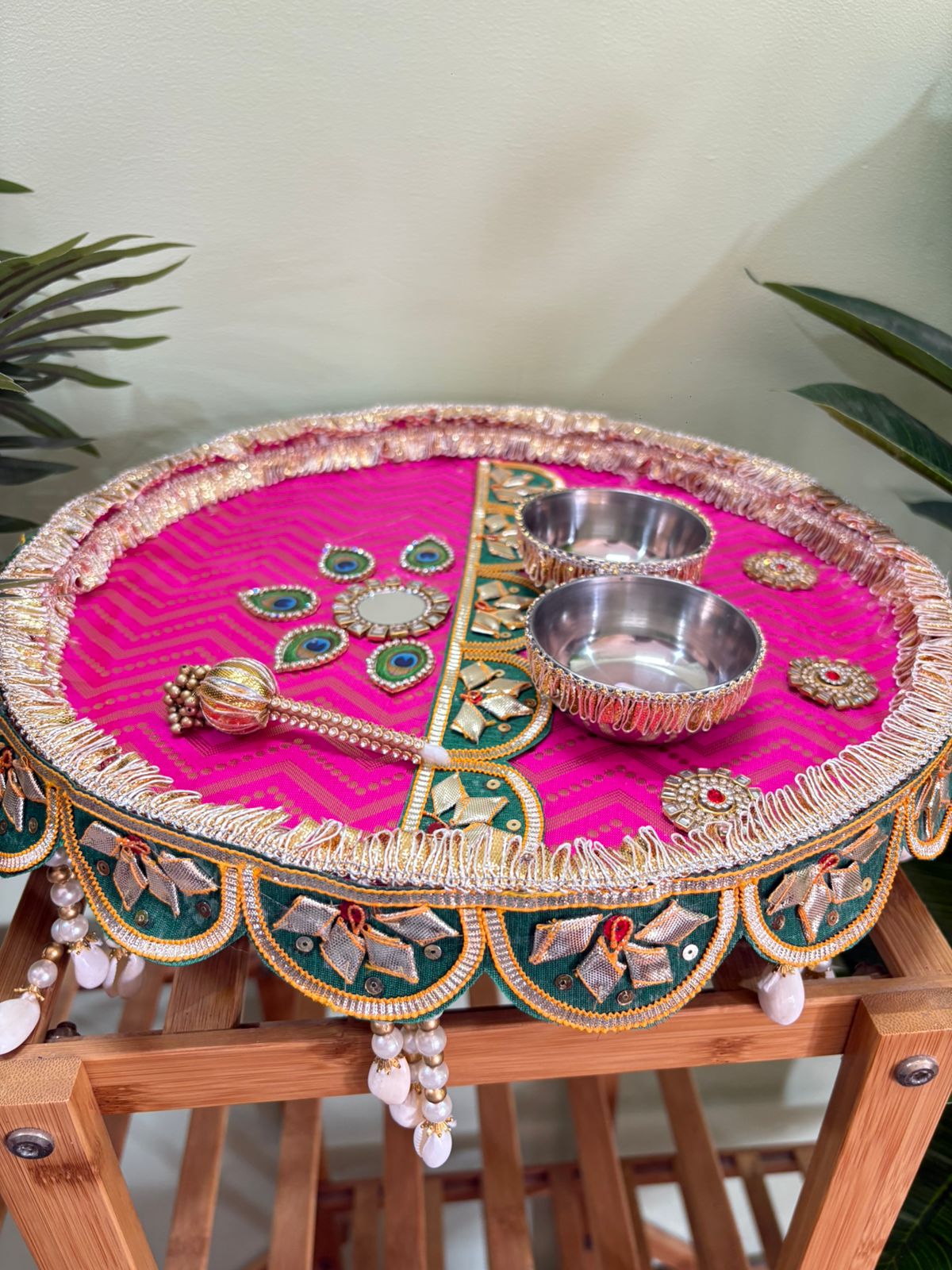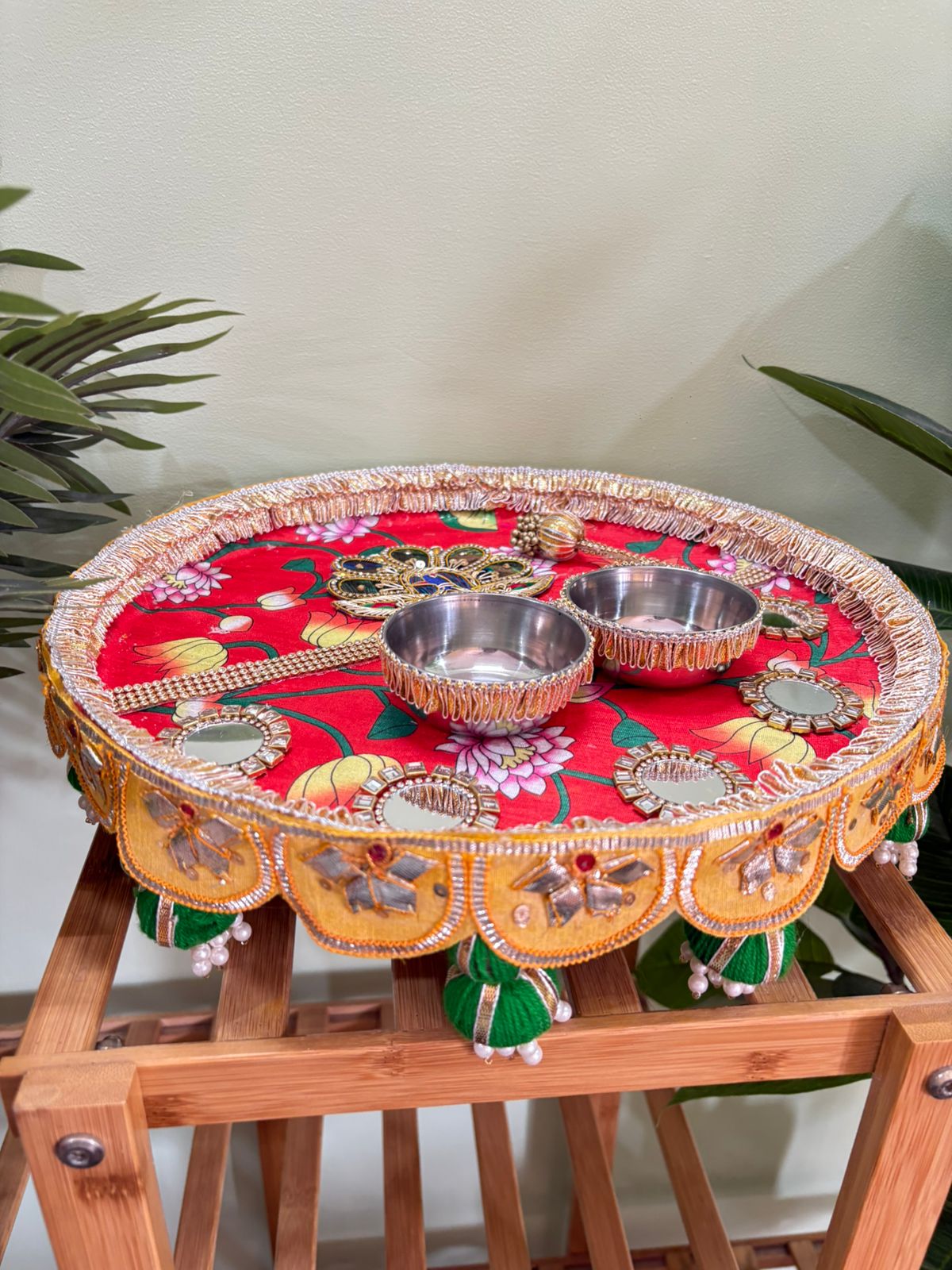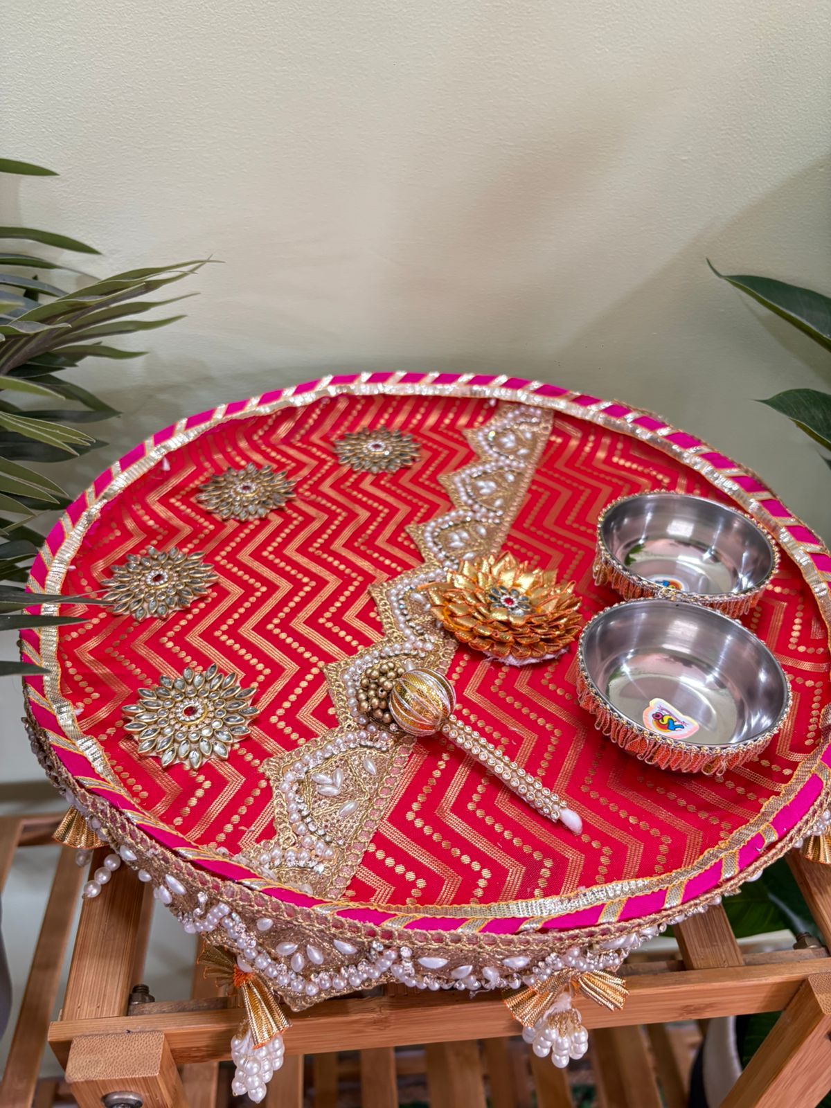 For marriages, functions, anniversaries and other special occasions we need different kinds of platters for gifting, haldi ceremony, mehendi ceremony or engagement ceremony too. These are premium steel thaal measuring 15″ diameter with very heavy quality and durable steel. It comes with roli chawal katori and 1 tilak stick also.