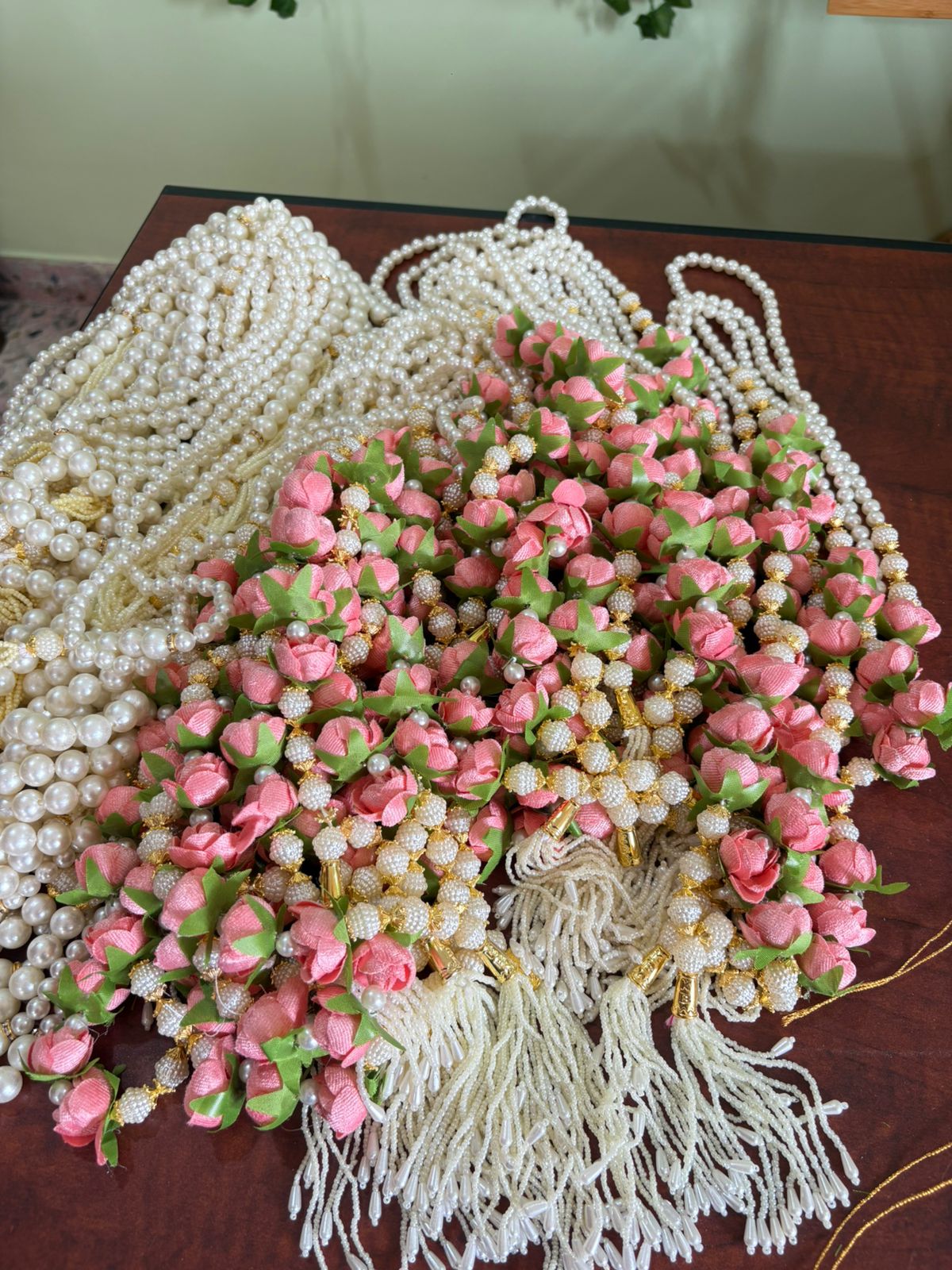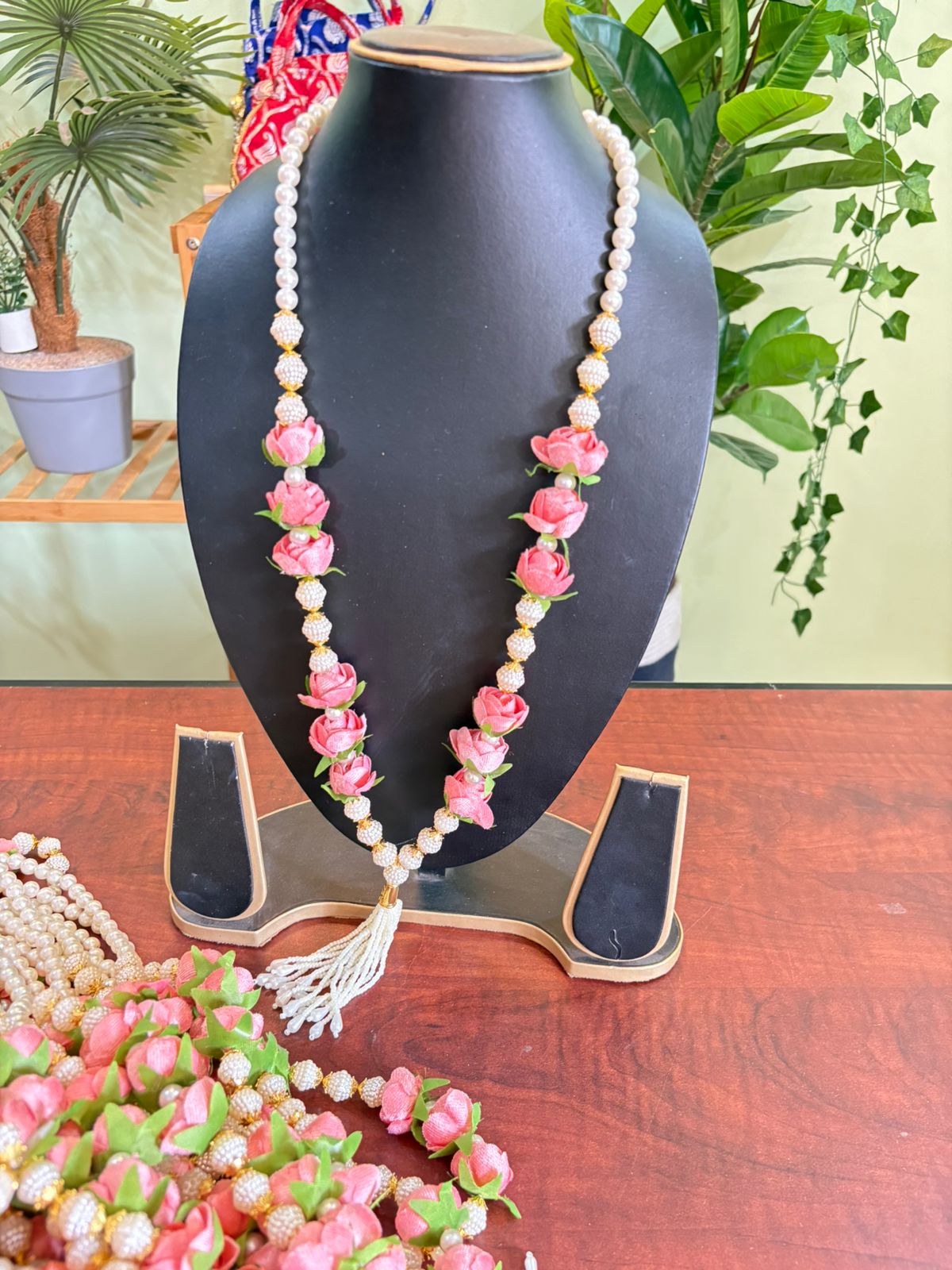 Theses swagat maalas can be worn around the neck and look very beautiful with kundan stone and heavy latkans. This maala has been handcrafted with cute miniature roses also woven into the maala. Its perfect for both men and women.