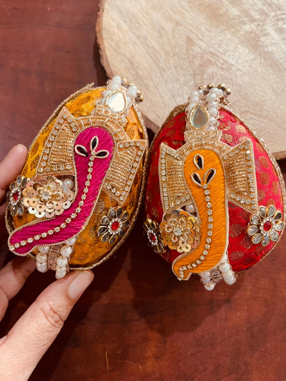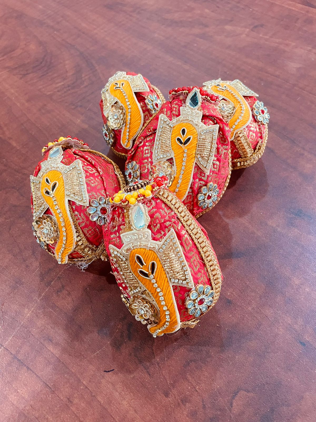 These are dry coconuts/nariyal and are an essential item in marriages or any other puja/function. Full coconut has been decorated with a beautiful ganesha in brocade base.