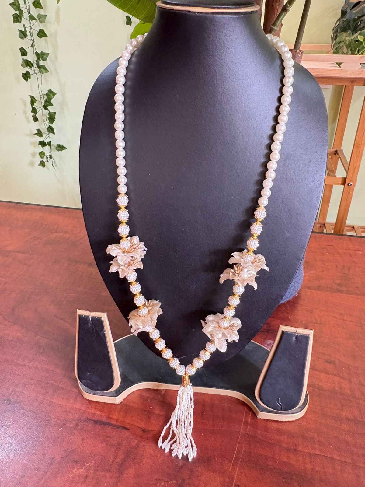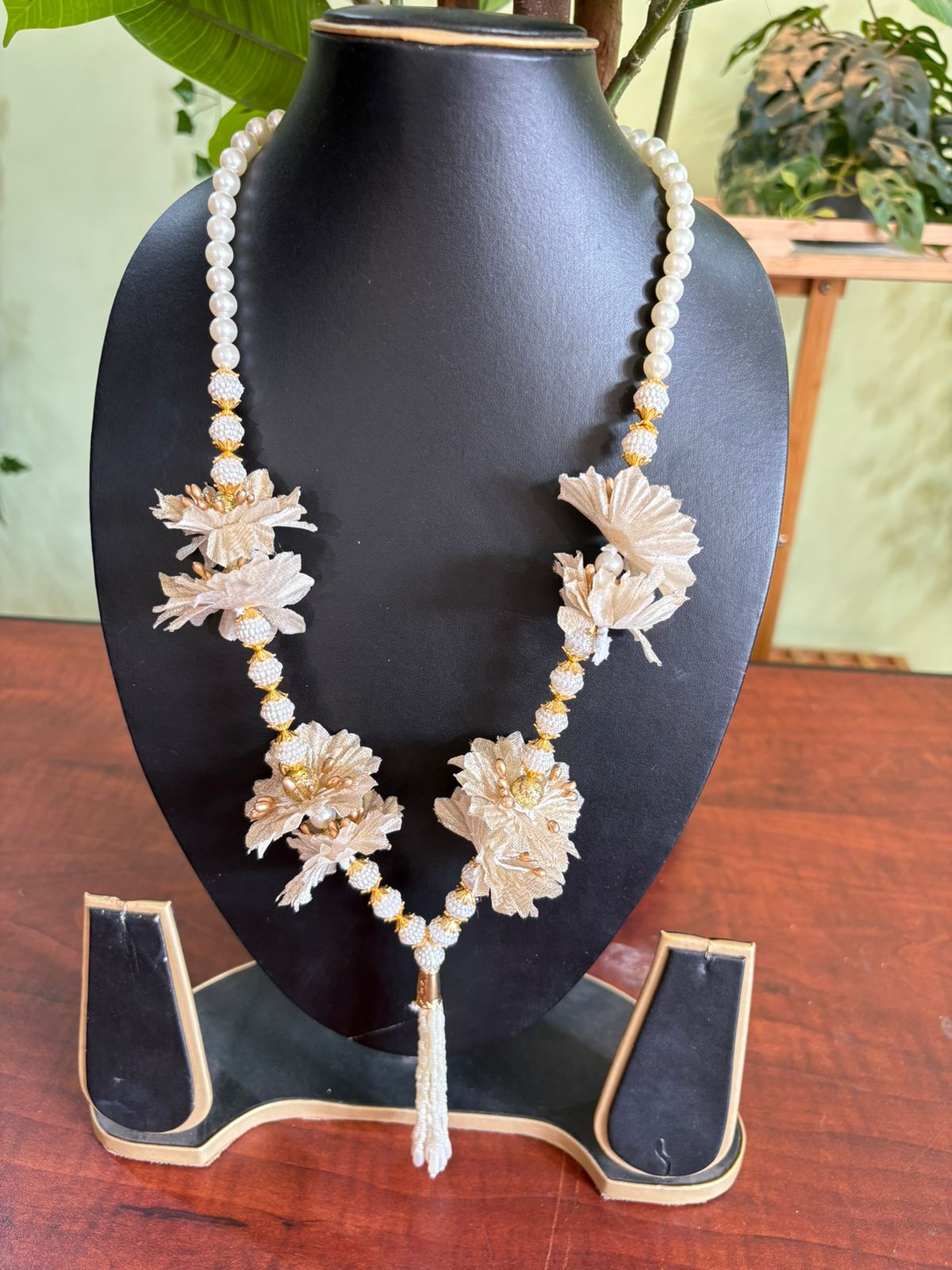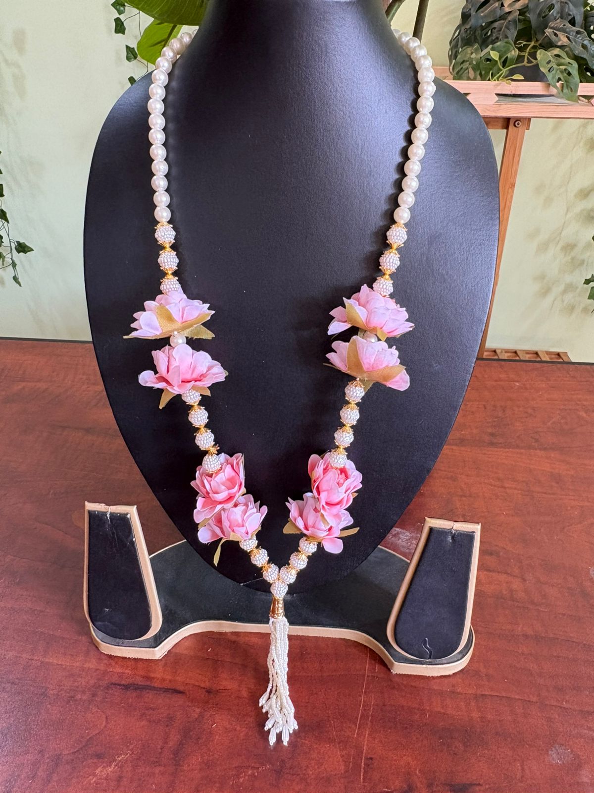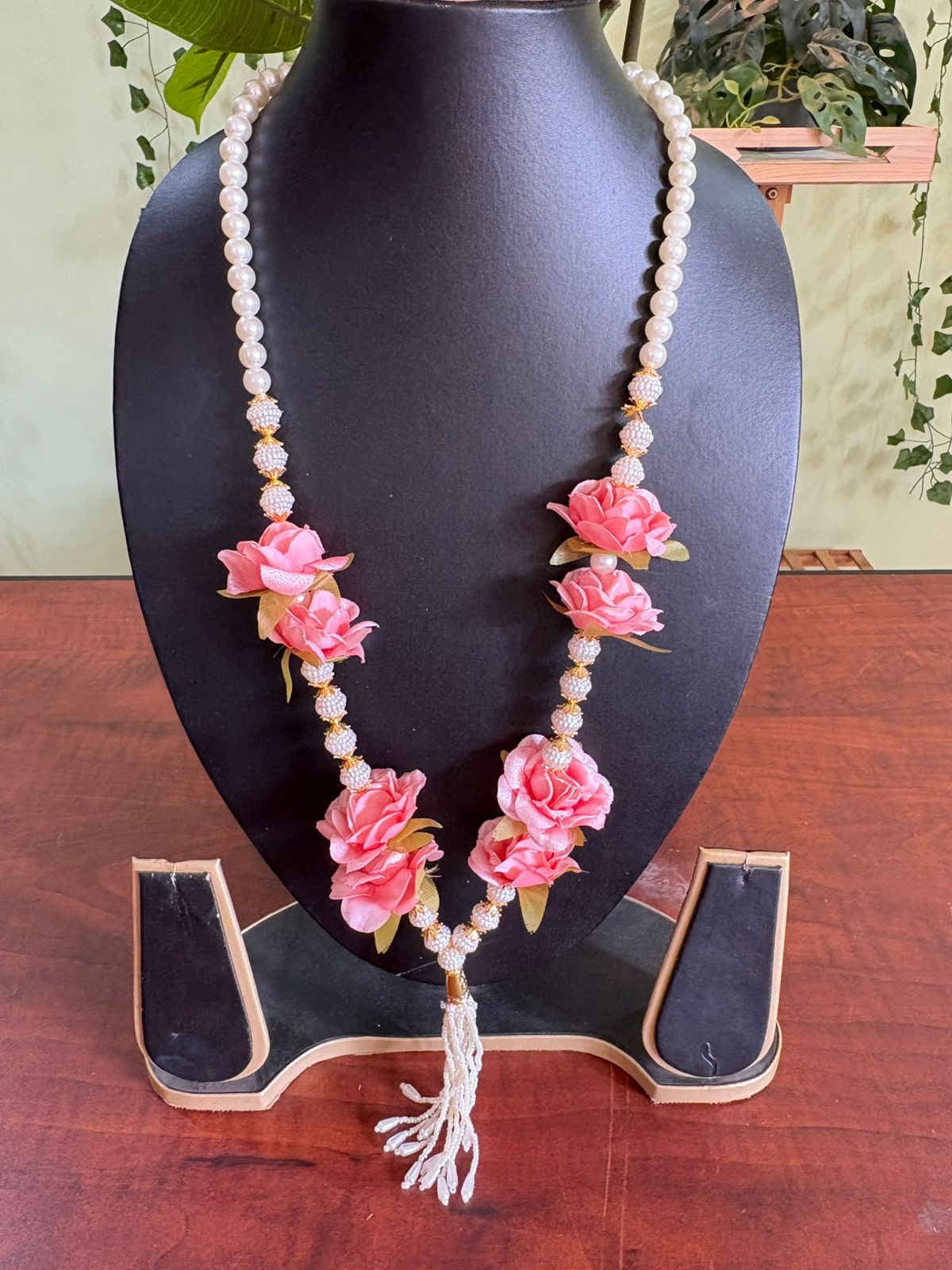 Theses swagat maalas can be worn around the neck and look very beautiful with kundan stone and heavy latkans. This maala has been handcrafted with cute miniature roses also woven into the maala. Its perfect for both men and women.
