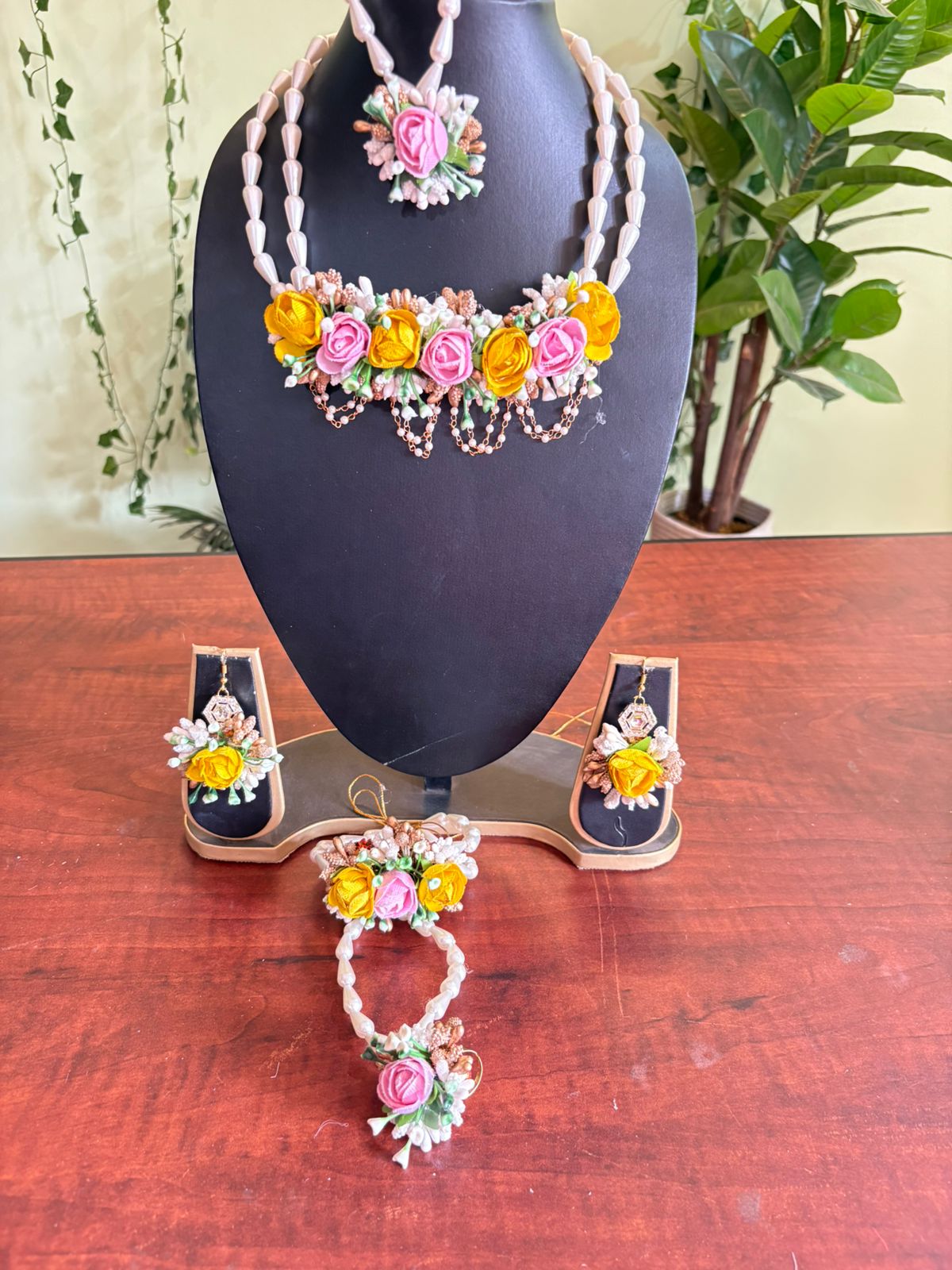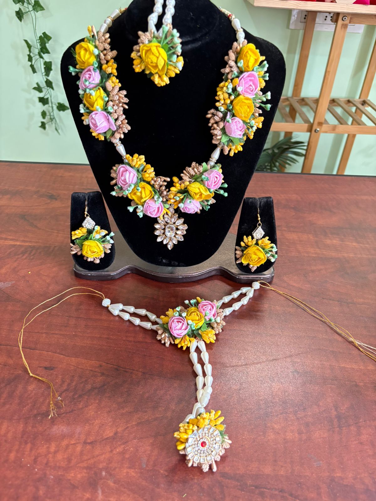 This is perfect for your haldi ceremony where usually the bride wears floral jewellery and the uniqueness of our product is the detailing and handcrafting with real looking flowers.